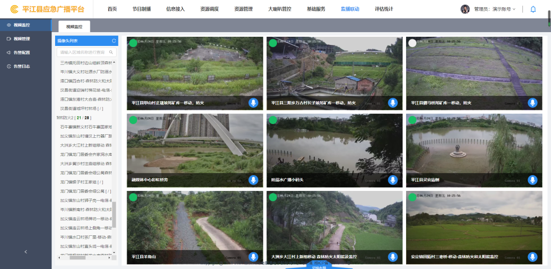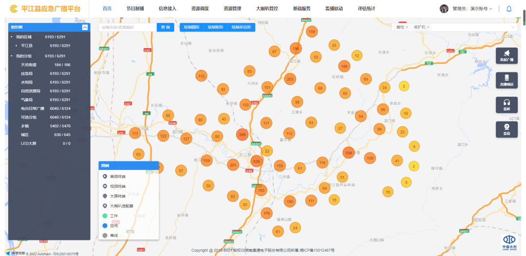 結合平江縣社會治理實際需求,特別在汨羅江平江縣城段流域增設“一江兩岸”禁漁禁捕、防溺水廣播點位;在平江縣城區主干道十字路口增設“城市文明創建”廣播點位;在平江縣境內尾礦庫增設預警廣播點位。此外,還增設了水庫監測廣播點位、地質災害廣播點位、戶外LED廣告大屏廣播點位,充分發揮多種社會治理場景下應急廣播的指揮調度和信息發布作用。