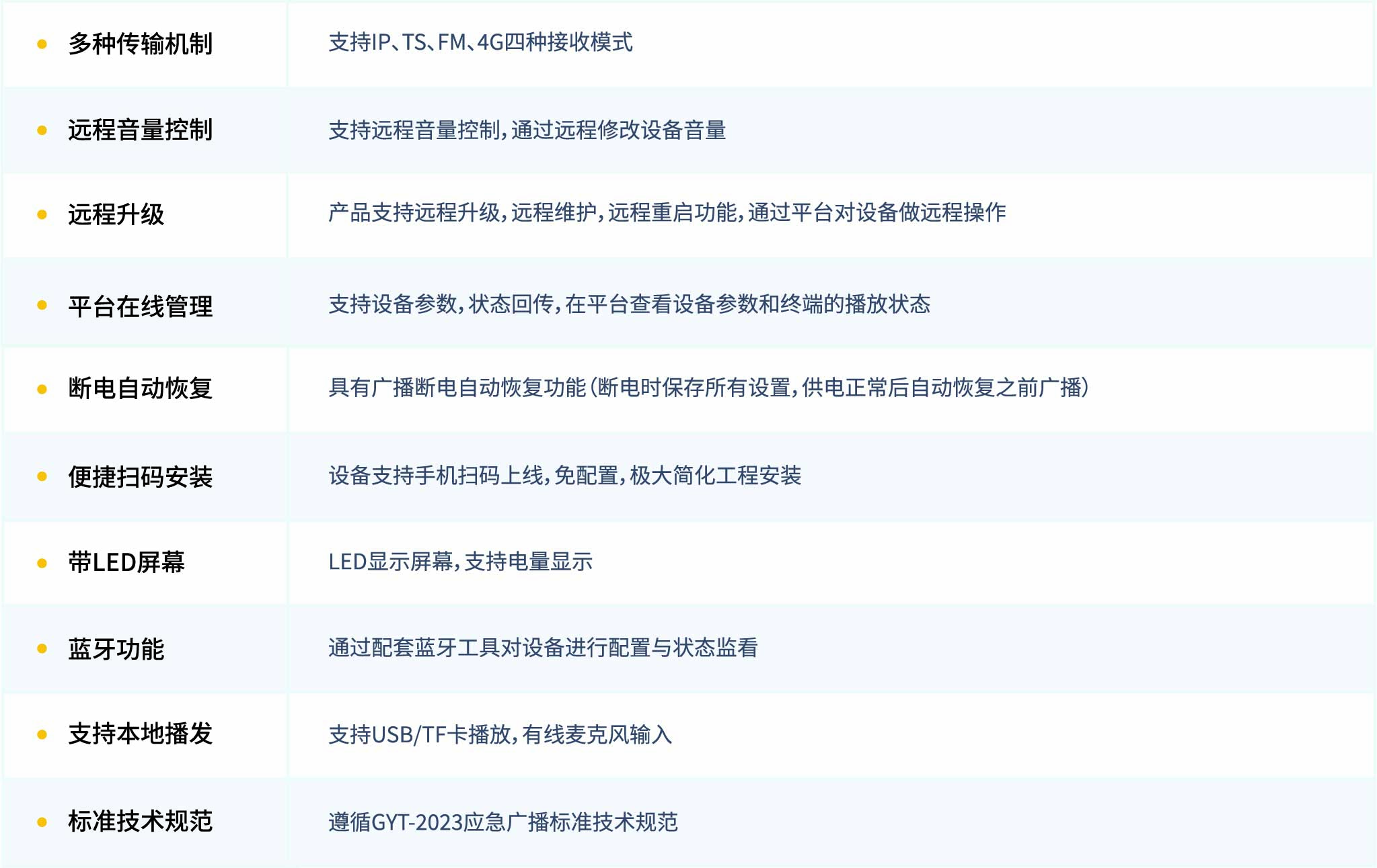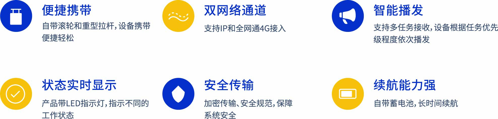 移動拉桿箱主要應用于應急廣播場景,接收標準的應急廣播并進行解析后放大音頻信號輸出至喇叭,同時可進行本地擴聲。采用專業設計制造的大容噩蓄電池,以及音箱專用電源電容,令蓄電量更大、更穩。產品支持IP、TS、FM 和 4G 四種接收模式(根據場景選配模式),同時支持與個人電腦、DVD、CD、收音機等任何有效音源輸出的裝置配接使用。